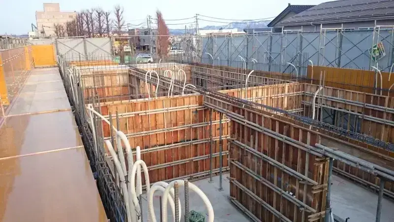 コンクリートの建物を建てる時に必要な型枠工事も行っています。基礎を作るための重要な工程となるため、責任を持って取り組んでいます。
